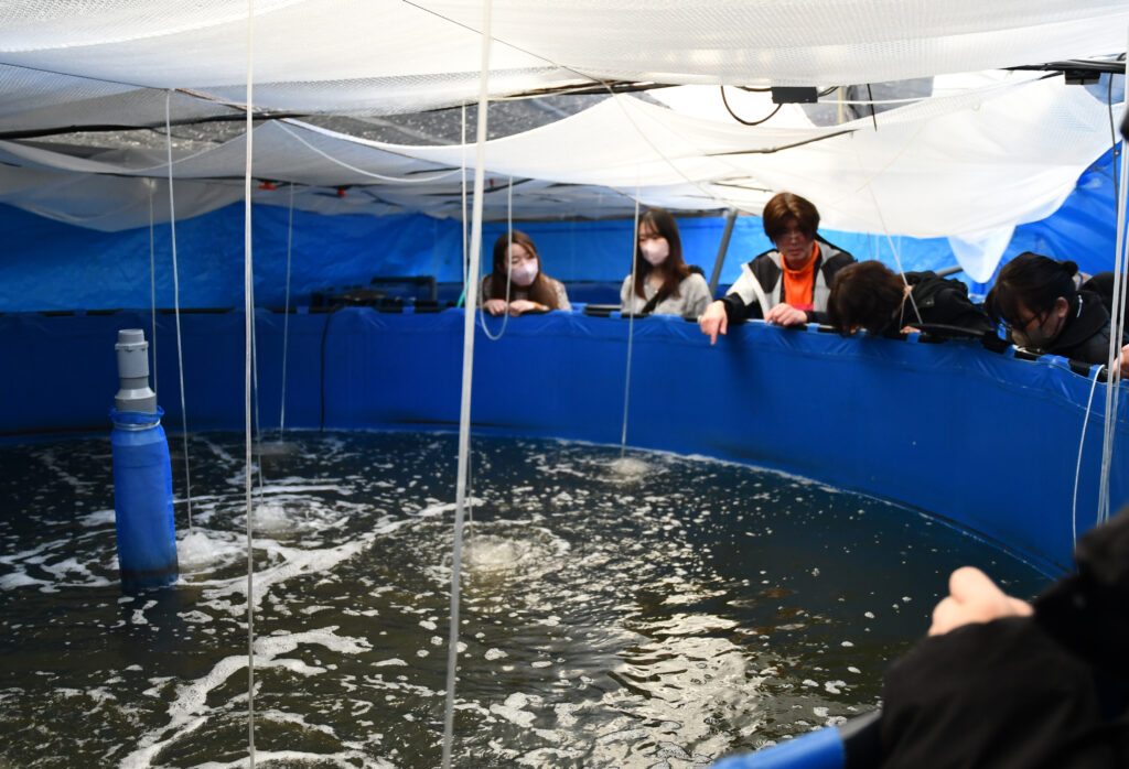 出迎えてくれたのは、代表取締役社長の松延紀至(まつのぶ のりゆき)さんと、養殖の現場を担当する大藪智樹(おおやぶ ともき)さんです。一行は2班に分かれ、1班は松延社長からHANERU葛尾の事業の説明を、もう1班は大藪さんから養殖の現場について話を聞きました。