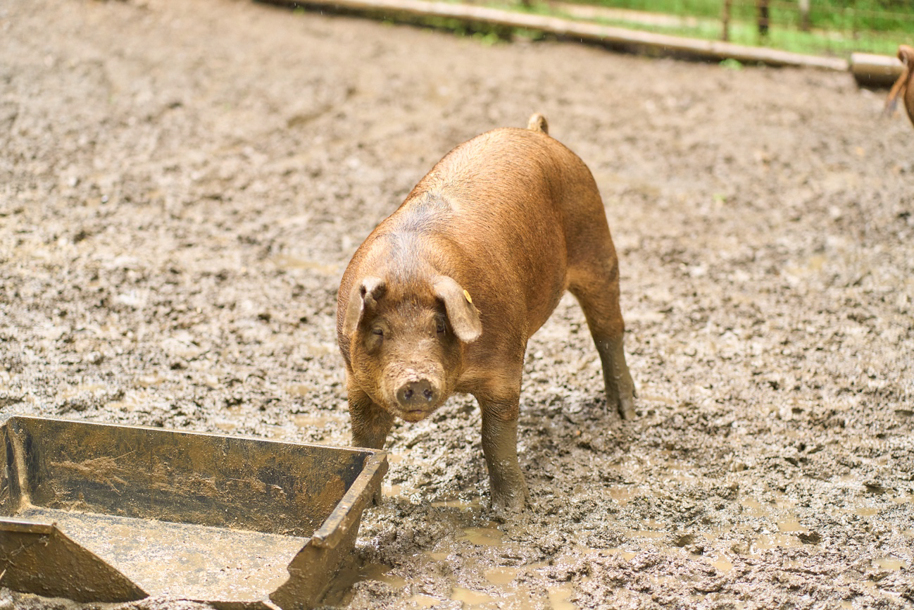 「⼀般的に流通する豚⾁の多くは、⾁質のよい品種を掛け合わせた豚に、さらに繁殖⼒の⾼い品種を掛け合わせ(3元豚)、味と供給量のバランスを取っています。しかしのびのびファームで扱う『⼤⽉のびのび放牧豚』は、⾁質のよい『バークシャー種』と質の⾼い脂を持つ『デュロック種』を掛け合わせたオリジナルの2元豚です。 放牧で育てた豚は運動量も多く、⼟のミネラル分も摂取し、⽢みのある脂と弾⼒のある⾁質に育ちます。