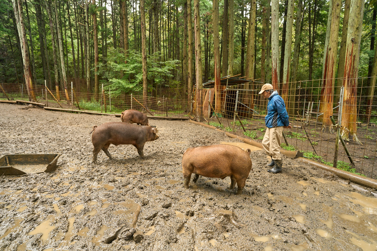餌は国産素材や残滓(ざんさい)をベースにしたオリジナルのもので、動物たちの健康と環境負荷の双⽅に配慮。放牧地は柵を⾼く設けるだけでなく、2重に丸太を埋め込み、⽳を掘る習性のある野⽣のイノシシが潜り込めないよう徹底した対策をとる。