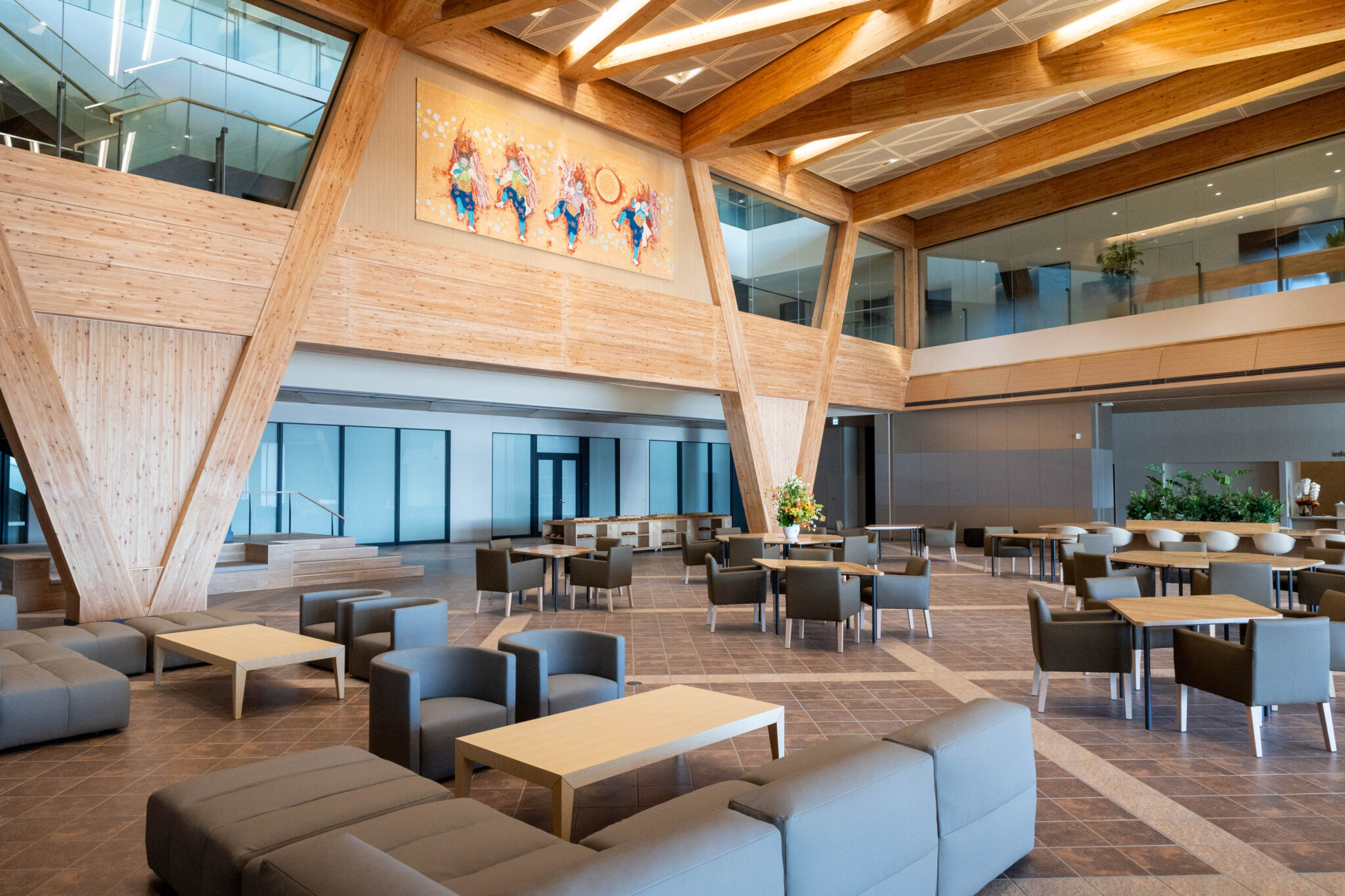 現在は、株式会社タイズスタイルにてマネージャーを務め、2025年3月に開業した「CREVAおおくま」の管理・運営を担当しています。CREVAおおくまは、来館される方が長時間滞在しても快適に過ごせるよう、空調、照明、湿度、香りといった環境要素に配慮した設計がなされています。例えば、床吹き出し式の空調を採用するなど、建物全体で快適性を高める工夫が随所に取り入れられています。また、館内外の照明計画にも配慮しており、日中はもちろん、夜間においても、周辺環境と調和した景観が形成されており、日中とは異なる魅力を感じていただける空間となっています。