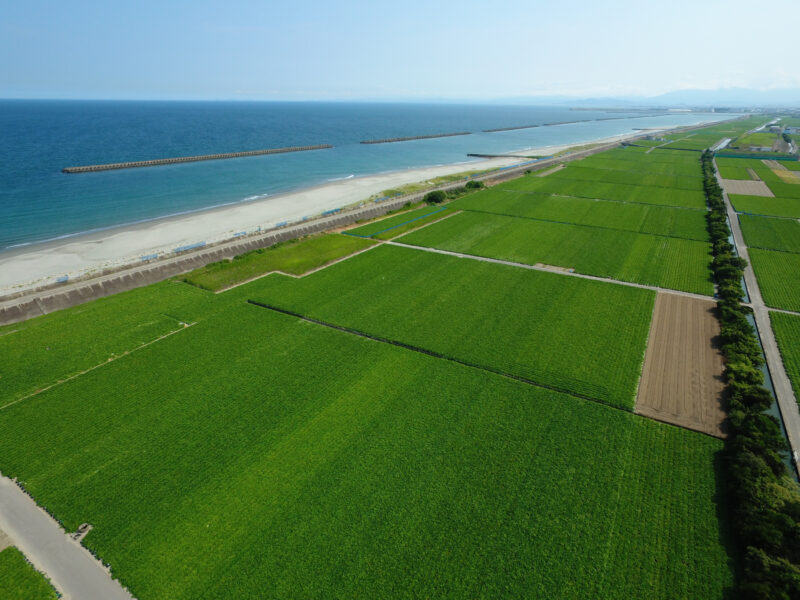 夏のさつまいも畑の様子。左奥に見えるのが「大手海岸」。砂浜と畑の間にサイクリングロードがある