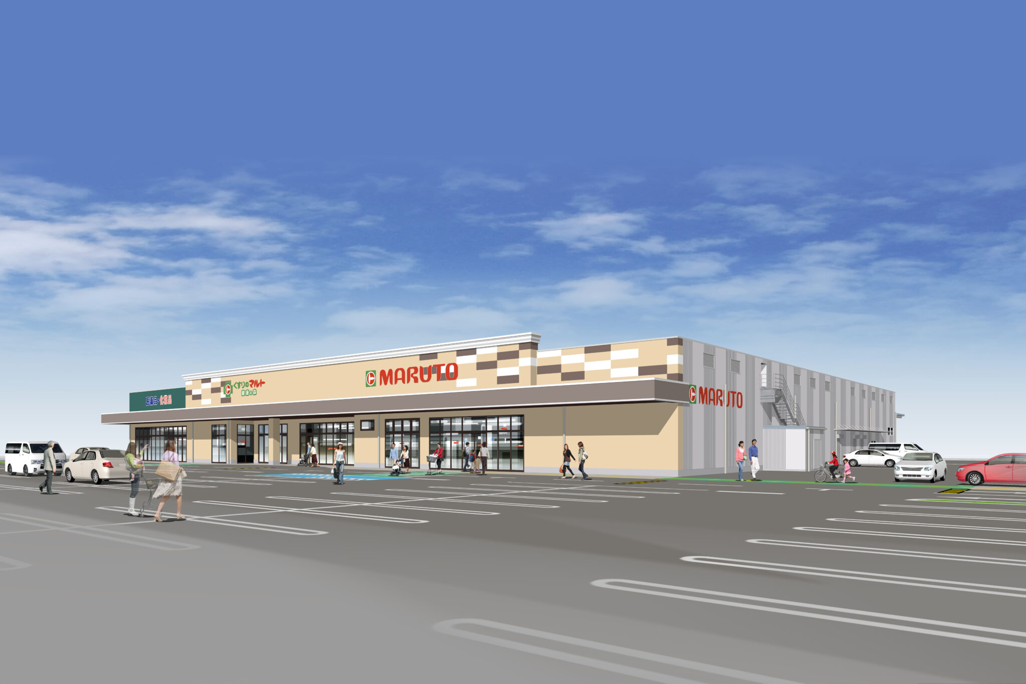 店舗の売場面積は2040平方メートル。食品、惣菜、衣料品などを扱うスーパーマーケットのほか、ドラッグストアや100円ショップが入る予定です。また、約120台が駐車できる駐車場も備えます。建物は町が建設しマルトが入居する「公設民営」という形で運営されます。