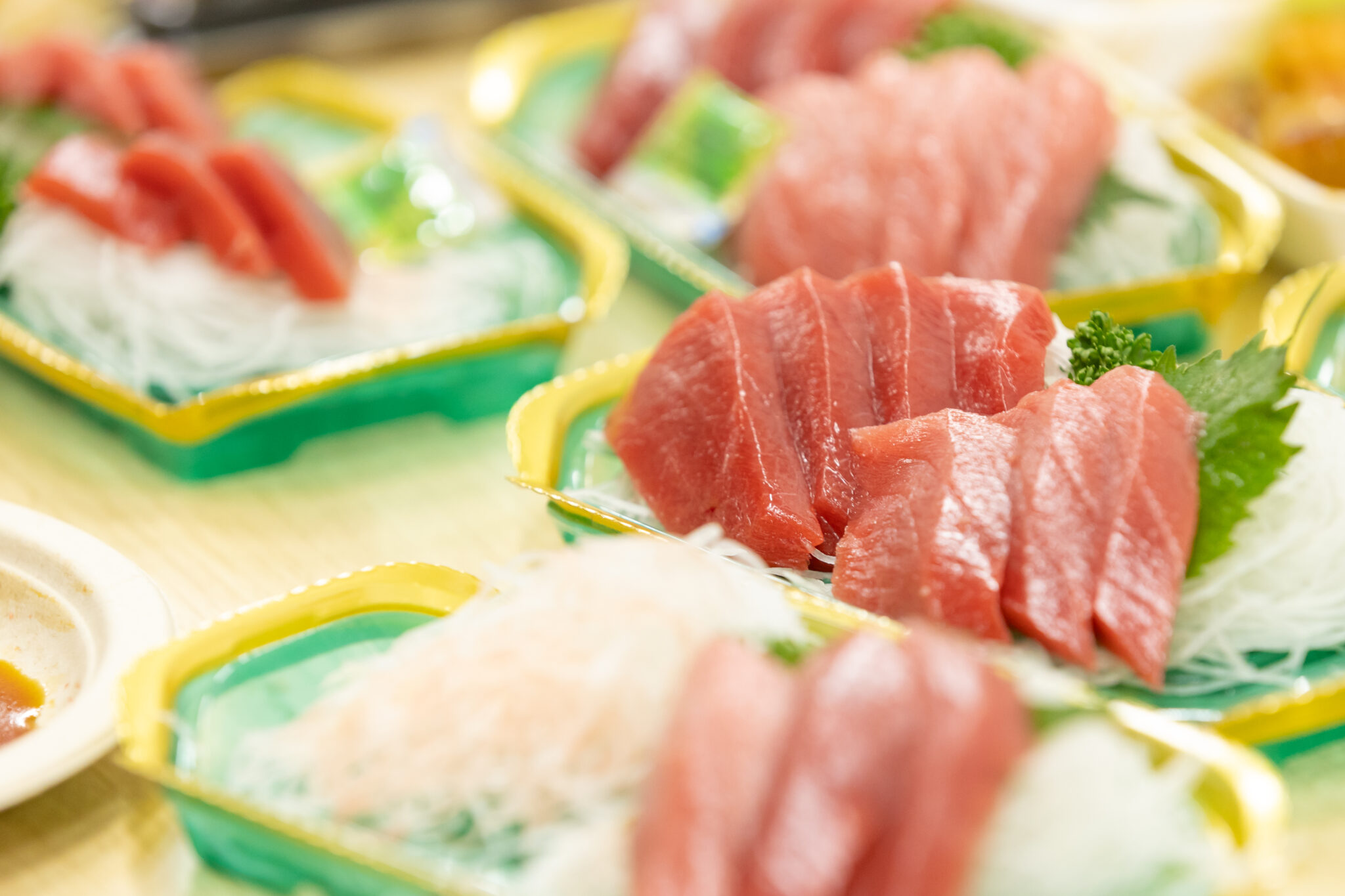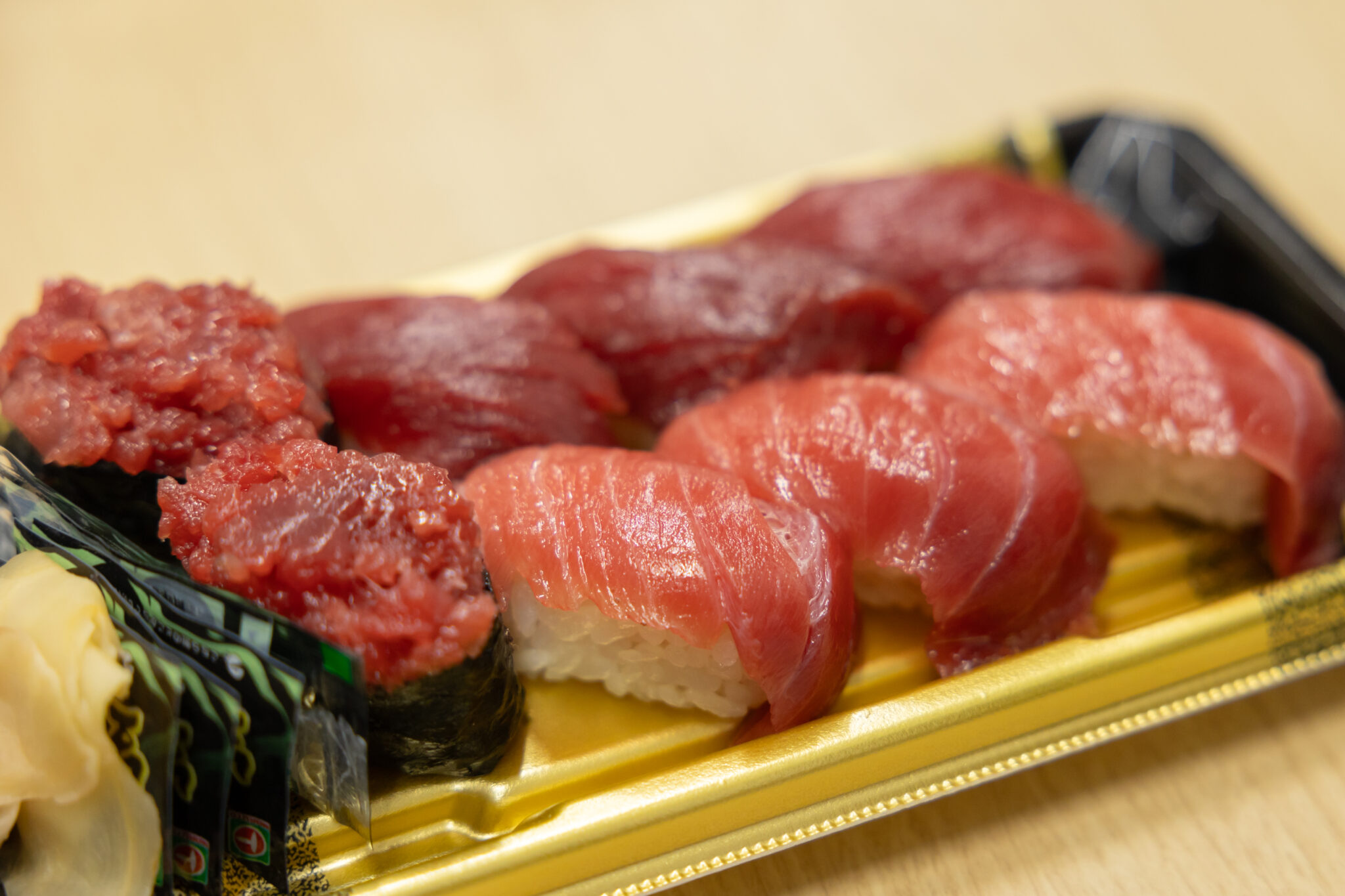 安島社長はこの日、いわき市内の店舗で作られたお寿司やえびやアナゴの天ぷら、餃子などの惣菜を携えてインタビューにいらっしゃいました。中でも目を引いたのはこだわりの生本マグロづくしのお寿司。赤身、中トロ、軍艦とシャリに載せられたマグロが光り輝いていました。