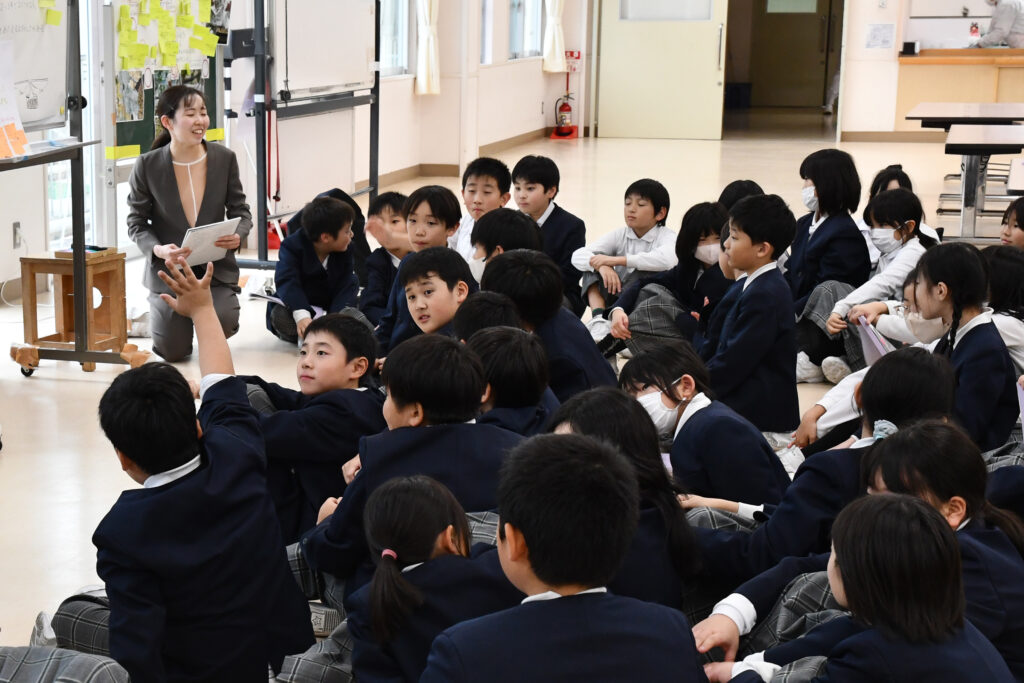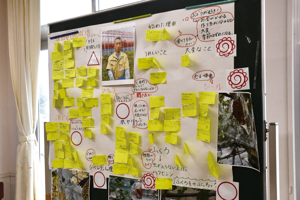2025年度の4年生は、数年前から町内でブドウ作りに挑戦する生産者を訪ね、その取り組みに継続的に触れてきました。ある日の授業では、校内の多目的ホールに集まり、これまでの探究で得た想いをそれぞれに発表。生産者と話して感じたことや新しく知ったことを貼りだしたホワイトボードを囲み、先生の問いかけに手を挙げ、思い思いに発言します。