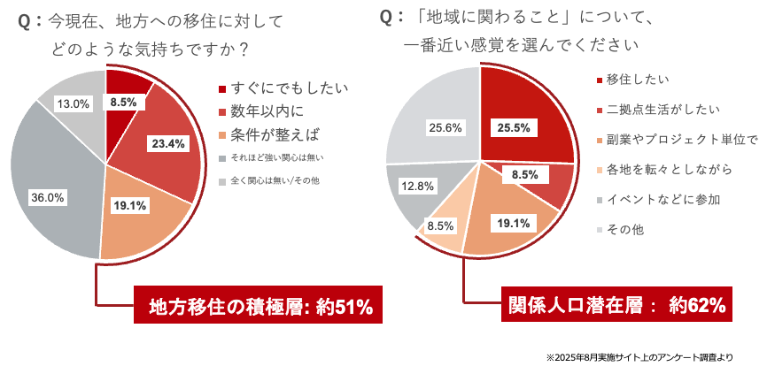 ・アンケート調査によると、50%以上が「地方移住」に積極的、60%以上が「関係人口潜在層」といえるユーザーアクセスしています。