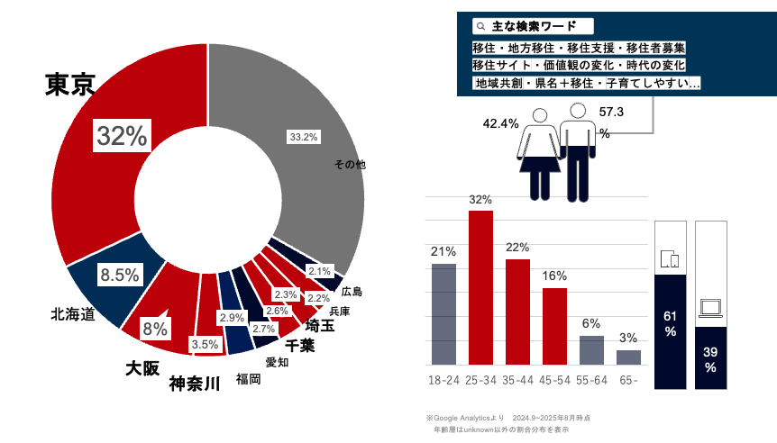 ・「移住」「関係人口」「移住支援」「地方移住」「テレワーク 地方」などの検索キーワードでのアクセスが多いサイトです。