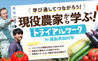農業に興味のある方に向けて、田村市で農業をたっぷりと体験できるオーダーメイド型農業体験「トライアルワーク」を実施します。 スタッフが体験先や体験日程などの要望をお聞きし、体験先の調整や滞在中の生活などをサポートいたします! [...]