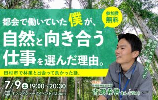 2022年7月9日(土)に、都会から福島県田村市に移住した方からお話を伺うオンライントークイベントを開催しました。今回は横浜で動物の飼育員をしていたのちに、田村市に移住して「林業」という未知の世界へ飛び込んだ「古瀬希啓さん」をゲストとしてお迎えし、なぜ横浜という都会から田村市への移住を決意したのか、どうして転職先として未知の仕事である「林業」を選択したのかなどについて、お話ししていただきました。ゲスト:古瀬希啓さん(田村森林組合所属) 埼玉県さいたま市出身 [...]