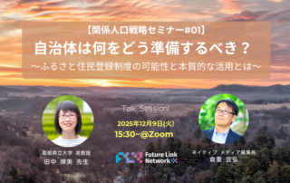 【関係人口戦略セミナー#01】自治体は何をどう準備するべき? 〜ふるさと住民登録制度の可能性と本質的な活用を探る〜お申し込みはこちら [...]By Nativ.media編集部|2025-11-10T09:41:26+09:002025.11.10|Tags: 地方自治体, 関係人口創出, オンラインセミナー, ふるさと住民登録制度| 続きを読む