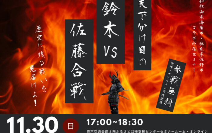 わかやまキャリアチェンジ応援プロジェクト2025-10-31T17:30:18+09:00【11/30ハイブリッド開催】和歌山県海南市・栃木県佐野市コラボ移住セミナー 天下分け目の鈴木VS佐藤合戦わかやまキャリアチェンジ応援プロジェクト2025-10-31T17:30:18+09:002025.10.31|