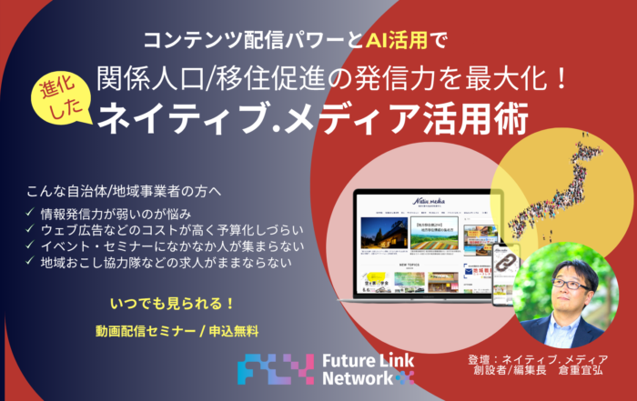Nativ.media編集部2025-10-31T16:28:21+09:00【動画配信セミナー】進化したネイティブ.メディア活用術〜コンテンツ配信パワーとAI活用で関係人口/移住促進の発信力を最大化!〜Nativ.media編集部2025-10-31T16:28:21+09:002025.10.31|