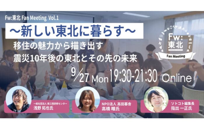 Nativ.media編集部2021-09-10T20:08:01+09:00Fw:東北 Fan Meeting 2021 Vol.1~「新しい東北」に暮らす ~ 移住の魅力から描き出す震災10年後の東北とその先の未来Nativ.media編集部2021-09-10T20:08:01+09:002021.09.07|