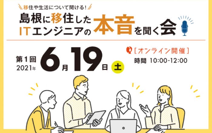 Nativ.media編集部2021-06-21T18:59:03+09:00【限定12名募集中】年間3,500人以上が移住する島根県が「島根に移住したITエンジニアの本音を聞く会」を今年度も開催。参加者には島根のIT企業見学ツアー参加のチャンスも!Nativ.media編集部2021-06-21T18:59:03+09:002021.06.13|