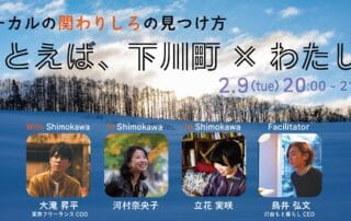 「シモカワベアーズラボラトリー」、略してベアラボは、オンライン上で人と人がつながり、学び、実践するためのコミュニティです。 「下川町のことが好き」「下川町で何かしたい」「下川町と何かしたい」という方々の、思いをつなぎ、新しいことを生み出す場になるような、オンラインコミュニティを始動します! [...]