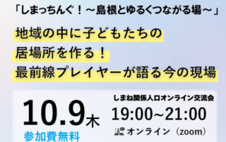 ■「しまコト」募集開始のお知らせ 島根に関心を持つ東京圏・関西圏の方々を対象に開催するソーシャル人材育成講座「しまコトアカデミー(通称:しまコト)」の募集が開始しました! [...]