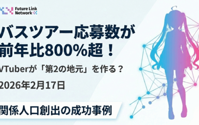 FLNの関係人口創出事業2026-03-26T09:49:30+09:00【事例解説】バスツアー応募数が前年比800%超!VTuberが「第2の地元」を作る?関係人口創出の成功事例By FLNの関係人口創出事業|2026-03-26T09:49:30+09:002026.03.26|