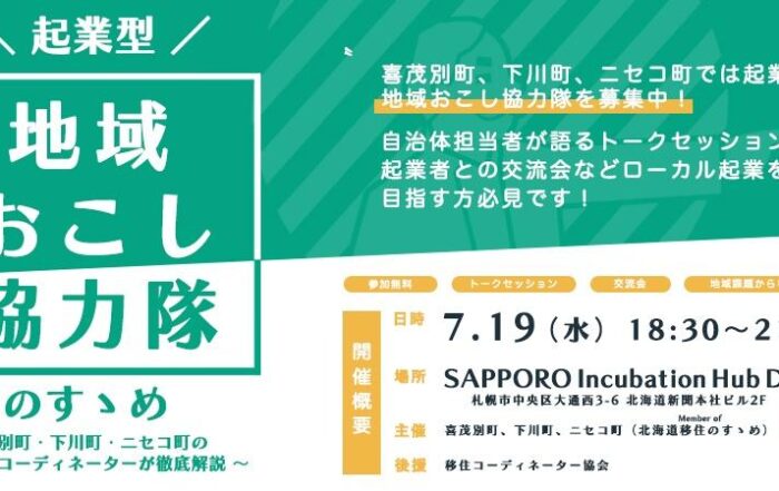 一般財団法人しもかわ地域振興機構2024-12-13T14:54:15+09:00[開催終了]起業型地域おこし協力隊のすゝめ〜喜茂別町・下川町・ニセコ町の移住コーディネーターが徹底解説〜 in札幌By 一般財団法人しもかわ地域振興機構|2024-12-13T14:54:15+09:002023.07.04|