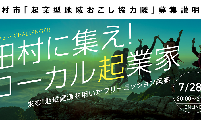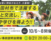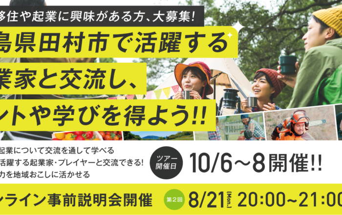 福島県田村市2023-08-16T13:32:11+09:00地方移住や起業に興味がある方、大募集!福島県田村市で活躍する起業家と交流し、ヒントや学びを得よう!8月21日(月) 説明会By 福島県田村市|2023-08-16T13:32:11+09:002023.07.05|