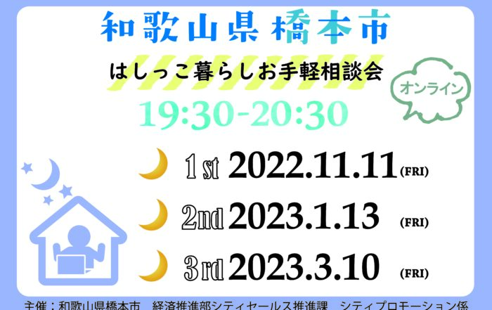 わかやまキャリアチェンジ応援プロジェクト2022-12-28T21:29:02+09:00【オンライン開催】日中は仕事でなかなか移住相談ができない…そんな方へ、オンライン&ナイターのお手軽相談会開催!〜和歌山県 橋本市主催〜By わかやまキャリアチェンジ応援プロジェクト|2022-12-28T21:29:02+09:002022.12.23|