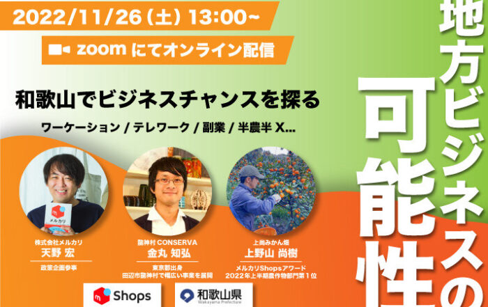 わかやまキャリアチェンジ応援プロジェクト2022-11-24T17:10:15+09:00【オンラインセミナー】メルカリshops×和歌山県 〜 ECで活躍するゲストが語る、目から鱗のテクニック・地方にいるからこそのメリットとは? 〜By わかやまキャリアチェンジ応援プロジェクト|2022-11-24T17:10:15+09:002022.11.23|