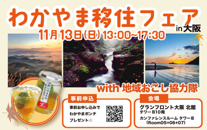 わかやまキャリアチェンジ応援プロジェクト2022-11-11T18:11:44+09:0011/13(日)in大阪|『わかやま』移住相談ブース&地域おこし協力隊OBのトークイベント開催!移住をするのに不安なあれこれ、根掘り葉掘り聞いてみませんか?By わかやまキャリアチェンジ応援プロジェクト|2022-11-11T18:11:44+09:002022.11.11|