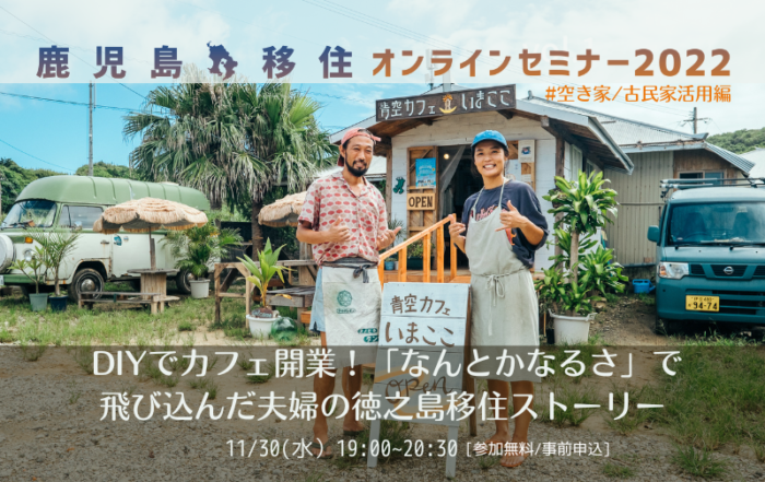 Nativ.media編集部2022-12-03T21:58:20+09:00【鹿児島・移住オンラインセミナー2022 】vol.4 #空き家/古民家活用編〜DIYでカフェ開業!「なんとかなるさ」で飛び込んだ夫婦の徳之島移住ストーリー〜By Nativ.media編集部|2022-12-03T21:58:20+09:002022.11.01|