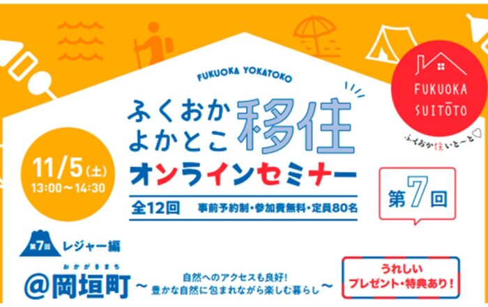 福岡県2022-10-25T15:49:37+09:00【11月5日(土)13:00~】オンラインセミナー開催!第7回レジャー編@岡垣町~自然へのアクセスも良好!豊かな自然に包まれながら楽しむ暮らし〜By 福岡県|2022-10-25T15:49:37+09:002022.10.25|