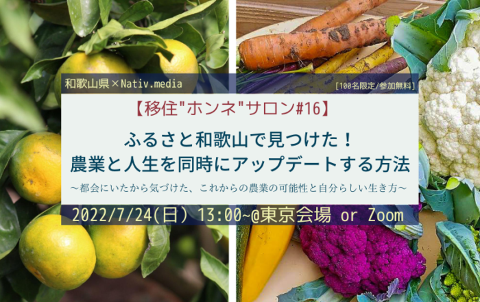 Nativ.media編集部2022-07-24T22:13:00+09:00[盛況の中終了]【地方移住”ホンネ”サロン#16】ふるさと和歌山で見つけた!農業と人生を同時にアップデートする方法〜都会にいたから気づけた、これからの農業の可能性と自分らしい生き方〜By Nativ.media編集部|2022-07-24T22:13:00+09:002022.07.20|