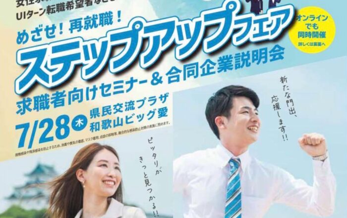 わかやまキャリアチェンジ応援プロジェクト2022-07-09T21:37:40+09:00【和歌山県主催】めざせ!再就職・転職!ステップアップフェア 〜 和歌山会場&オンラインにて同時開催 〜By わかやまキャリアチェンジ応援プロジェクト|2022-07-09T21:37:40+09:002022.06.30|