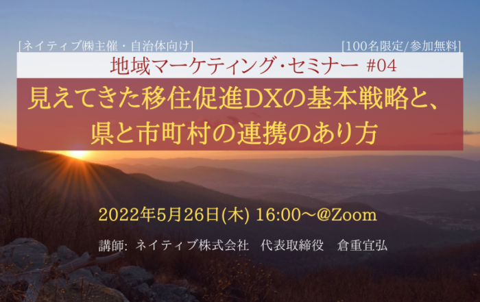 Nativ.media編集部2022-06-06T17:00:36+09:00<盛況の中終了>【自治体向け】<地域マーケティング・セミナー#04> 見えてきた移住促進DXの基本戦略と、県と市町村の連携のあり方By Nativ.media編集部|2022-06-06T17:00:36+09:002022.05.23|
