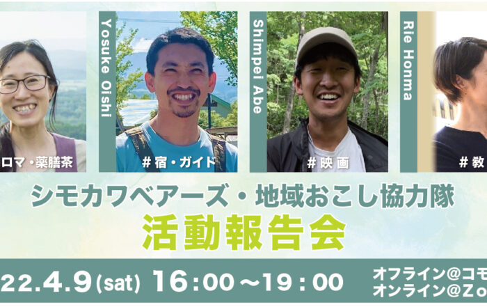 一般財団法人しもかわ地域振興機構2024-12-13T15:52:09+09:00[開催終了]4/9(土)シモカワベアーズ・地域おこし協力隊活動報告会を開催しますBy 一般財団法人しもかわ地域振興機構|2024-12-13T15:52:09+09:002022.04.01|