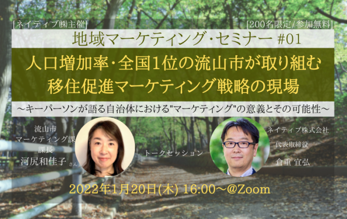 Nativ.media編集部2022-01-21T09:16:55+09:00<<大盛況の中終了>>【地域マーケティング・セミナー#01】人口増加率全国1位の流山市が取り組む移住促進マーケティング戦略の現場〜キーパーソンが語る自治体における”マーケティング”の意義とその可能性〜By Nativ.media編集部|2022-01-21T09:16:55+09:002022.01.06|