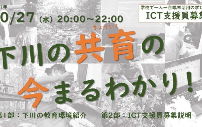 一般財団法人しもかわ地域振興機構2025-01-07T14:58:56+09:00[開催終了]北海道下川町の教育環境まるわかり!『共育(きょういく)』って?【10/27開催】By 一般財団法人しもかわ地域振興機構|2025-01-07T14:58:56+09:002021.10.21|