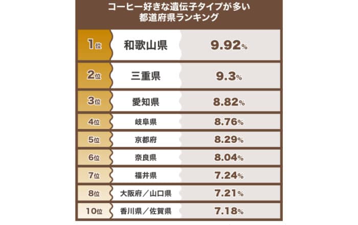 Nativ.media編集部2021-10-11T15:34:56+09:00コーヒー好きな遺伝子タイプが多い都道府県ランキング、1位は和歌山県!近畿エリアがコーヒーを好む傾向にBy Nativ.media編集部|2021-10-11T15:34:56+09:002021.10.08|