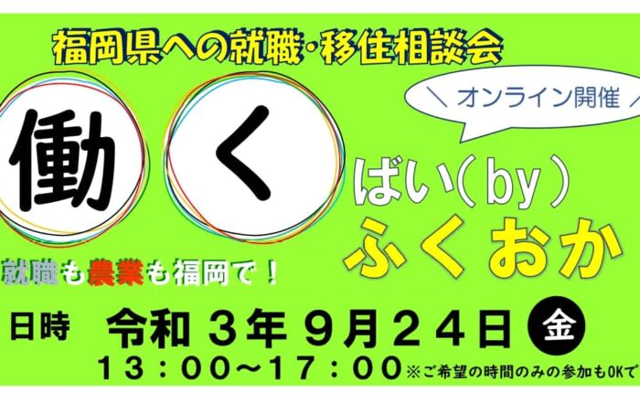 福岡県2021-09-02T13:16:49+09:00【9月24日(金)オンライン開催】福岡県への就職・就農・移住相談会「働くばい(by)ふくおか」を開催します!By 福岡県|2021-09-02T13:16:49+09:002021.08.13|