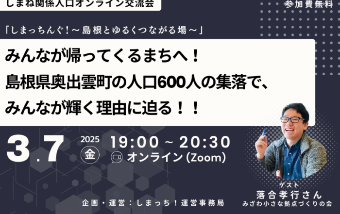 【島根県】しまね移住project2025-02-27T09:27:08+09:00【島根との関わりは自分次第!】あなたと地域をつなぐオンライン交流イベント「しまっちんぐ!」の参加者を募集します!By 【島根県】しまね移住project|2025-02-27T09:27:08+09:002025.02.27|