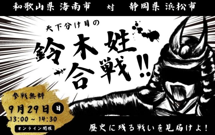 わかやまキャリアチェンジ応援プロジェクト2024-08-08T08:29:42+09:00【オンライン開催】和歌山県海南市VS静岡県浜松市 天下分け目の鈴木姓合戦!!By わかやまキャリアチェンジ応援プロジェクト|2024-08-08T08:29:42+09:002024.08.08|