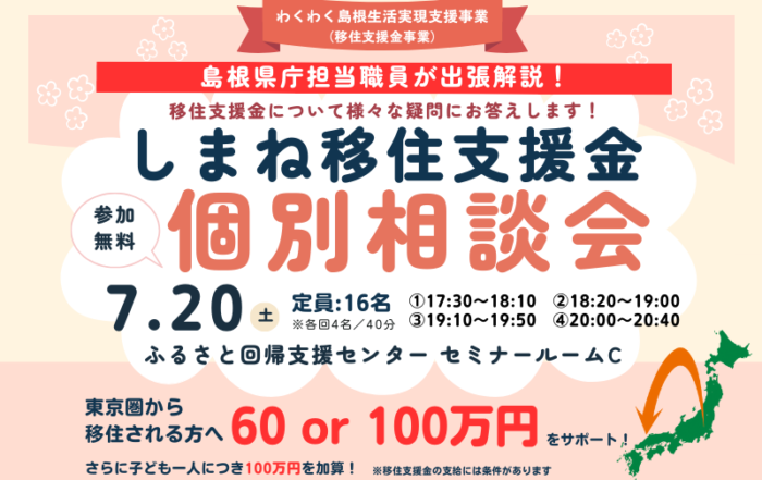【島根県】しまね移住project2024-07-17T11:44:43+09:00《60万or100万円をサポート!》しまね移住支援金個別相談会【東京開催!】By 【島根県】しまね移住project|2024-07-17T11:44:43+09:002024.06.18|