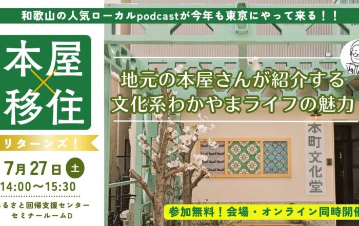 わかやまキャリアチェンジ応援プロジェクト2024-06-20T02:47:33+09:00【東京・オンライン同時開催】本屋×移住 リターンズ!~地元の本屋さんが紹介する文化系わかやまライフの魅力~ イベントBy わかやまキャリアチェンジ応援プロジェクト|2024-06-20T02:47:33+09:002024.06.20|