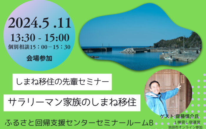 【島根県】しまね移住project2024-09-11T14:42:03+09:00しまね移住の先輩セミナー vol.1 ~サラリーマン家族のしまね移住~By 【島根県】しまね移住project|2024-09-11T14:42:03+09:002024.04.12|