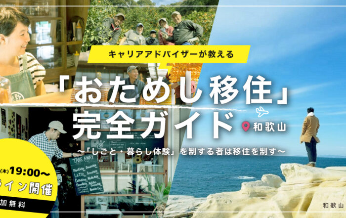 わかやまキャリアチェンジ応援プロジェクト2024-01-23T12:36:45+09:00【オンライン開催】 移住キャリアアドバイザーが教える「お試し移住」完全ガイド!By わかやまキャリアチェンジ応援プロジェクト|2024-01-23T12:36:45+09:002024.01.23|