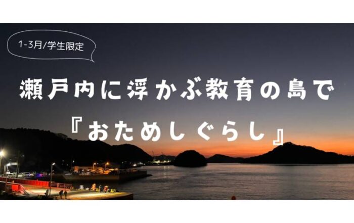 移住スカウトサービス【SMOUT】2024-02-08T20:58:27+09:00【1〜3月/学生限定】瀬戸内に浮かぶ教育の島で『おためしぐらし』By 移住スカウトサービス【SMOUT】|2024-02-08T20:58:27+09:002024.01.22|
