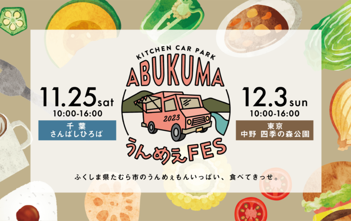 福島県田村市2023-11-02T21:37:22+09:00オシャレで人気のキッチンカーが大集合!旅する気分になれる食の祭典「KITCHENCAR PARK-ABUKUMA うんめぇFES」開催!(11月25日(土)@千葉・12月3日(日)@東京)By 福島県田村市|2023-11-02T21:37:22+09:002023.11.02|