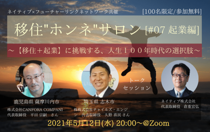 Nativ.media編集部2021-05-25T18:19:51+09:00盛況の中終了【地方移住”ホンネ”サロン】#07☆起業編☆〜「移住+起業」に挑戦する、人生100年時代の選択肢〜Nativ.media編集部2021-05-25T18:19:51+09:002021.04.28|